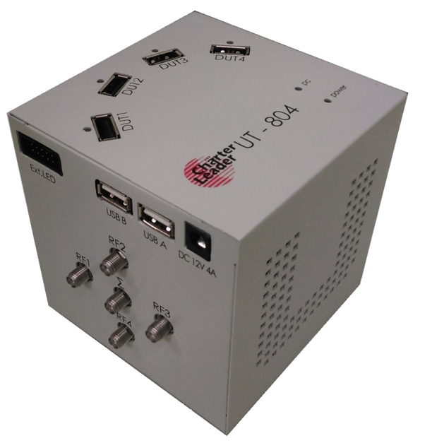 UT-804 是個1對4的射頻及USB切換模組,具同時切換4選1個射頻及USB接口功能,由於只有10公分立方的體積,特別適合置於屏蔽箱內,同時放入4個USB介面的待測,一起上電開機,然後進行串列測試。